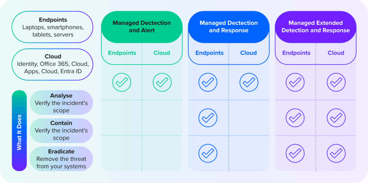 Managed Detection and Alert can be treated as a “light” version of MDR, providing detection and monitoring services across a number of security endpoints. However, the managed service does not include any incident response capabilities – either containing or responding – once a threat is detected.